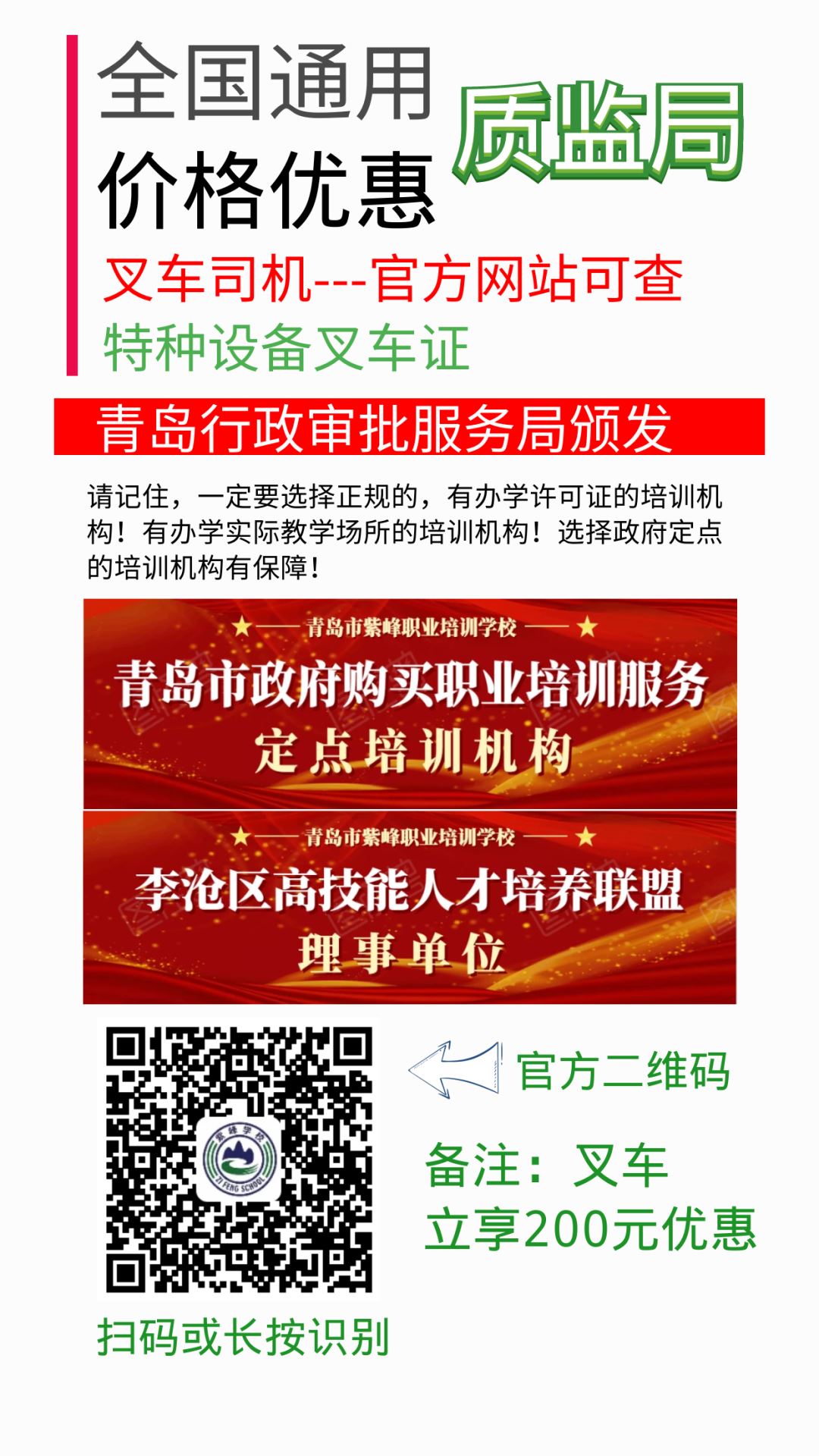 让您---轻松---通过/取证 考高处作业类证书到紫峰,通过率高周期短 青岛市失业人员指定(定点)培训机构 17年教学管理经验 叉车证书分类:特种设备作业证 考试时间:每月中旬和月底考试,报名一周即可考试。 考试课目:理论+实操(理论100分80分合格,实操80分合格)考试前,考场设备实操练习,让您更熟悉考试现场皂角首乌密发液) 理论:电脑答题 实操:特种设备作业证基本操作(基础性强考试不难) 取证周期:20天取证