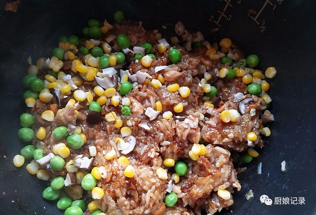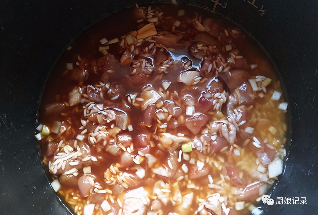 2、300克糯米淘洗干净,然后将腌制好的鸡肉拌入糯米中再加少量水没过米和肉,放入电饭锅中煮熟。