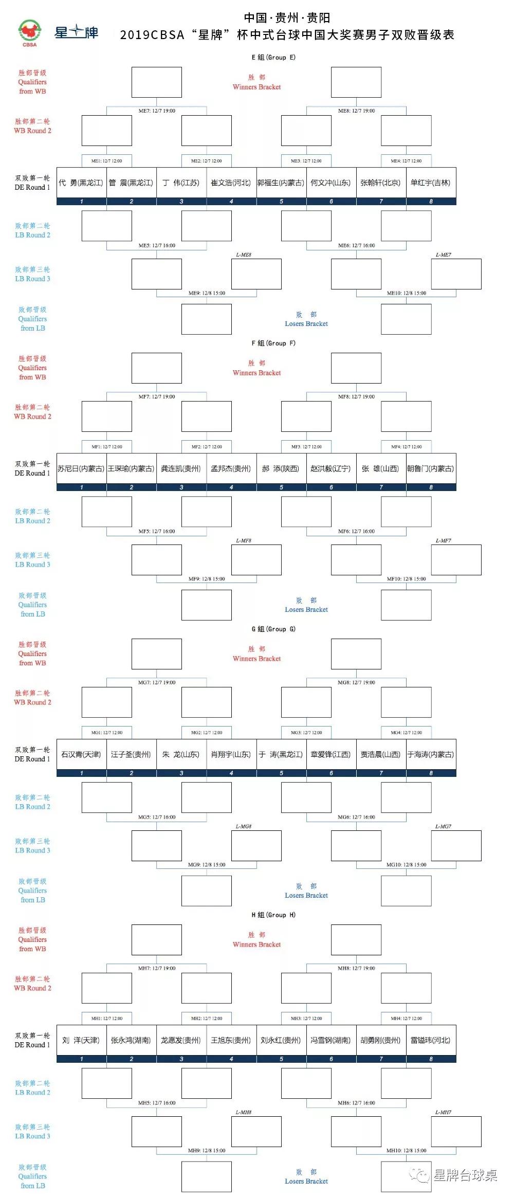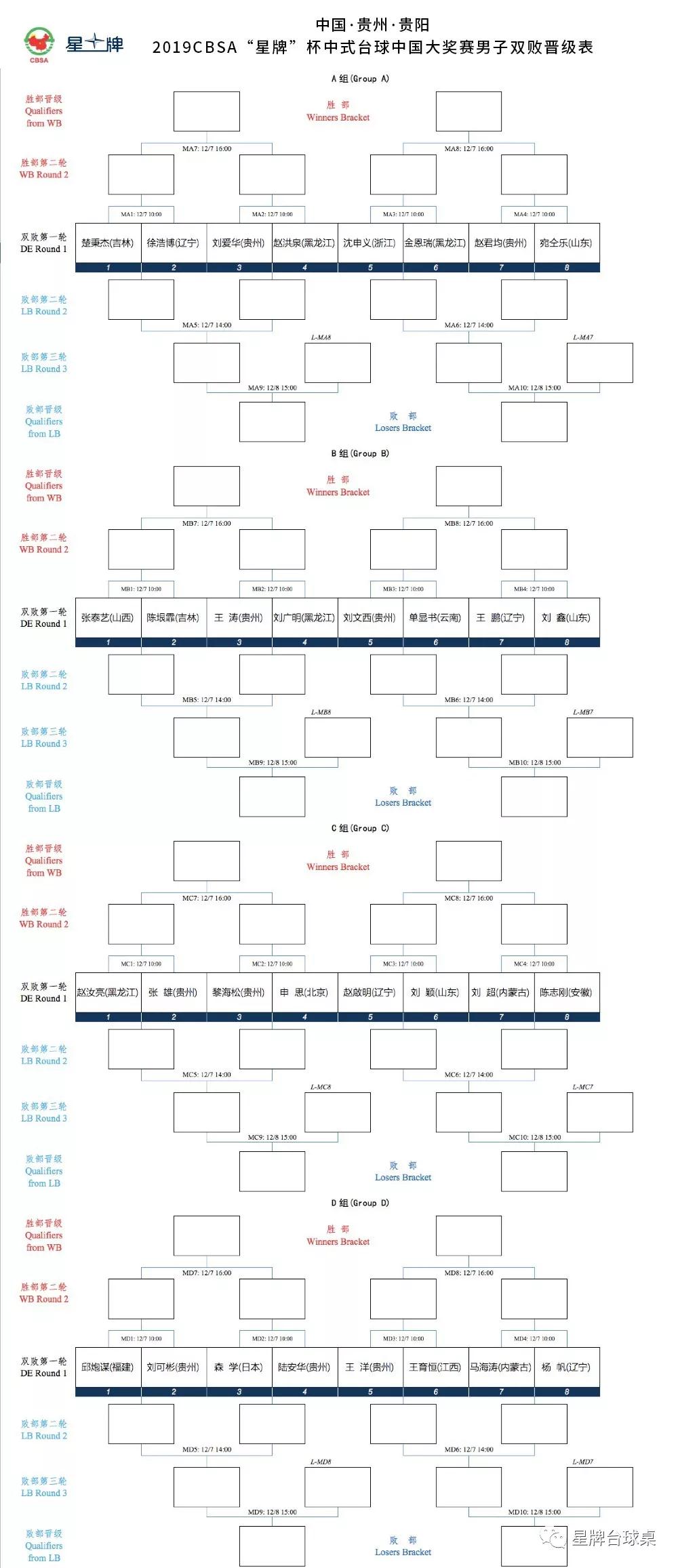 星牌台球讯 12月6日,中国·贵州·贵阳2019CBSA“星牌”杯中国式台球中国年夜奖赛会内赛双败阶段签表出炉。双败镌汰赛采用 轮流开球,须眉组13局7胜,女子组则为9局5胜。