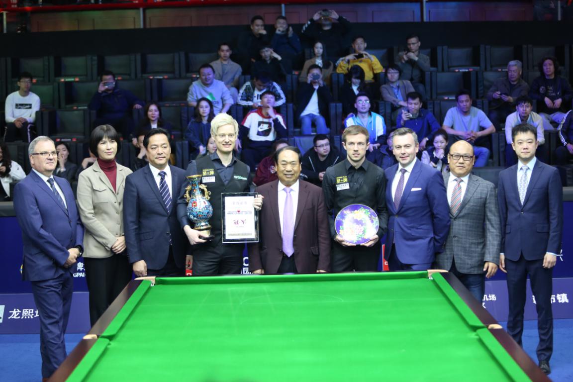 中国台球协会副主席兼秘书长王涛、北京星伟体育用品有限公司总司理甘佳岭分离为杰克·利索夫斯基发表亚军奖杯、奖金和证书