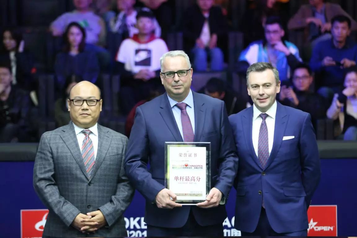 世界斯诺克协会主席杰森?弗格森、北京市政协委员、星牌团体副总裁甘佳庚,分离为斯图亚特·宾汉姆发表满分奖及单杆最高分奖发表证书和奖金,世界斯诺克有限公司商务总监迈尔斯·皮尔斯代为领取