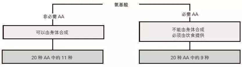 蛋白质是由被称为“蛋白质的结构单元”的氨基酸链(AA)组成。有20 种不同的氨基酸,机体可以从我们吃的食物中合成其中的11 种(非必需氨基酸),而剩余的9 种(必需氨基酸)必须通过饮食来提供。