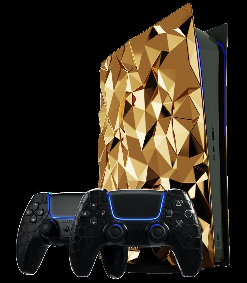 下面这台 PS5 的表面,共覆盖了 3.8kg 的 18K 黄金,官方将其成为「真正的珠宝杰作」。