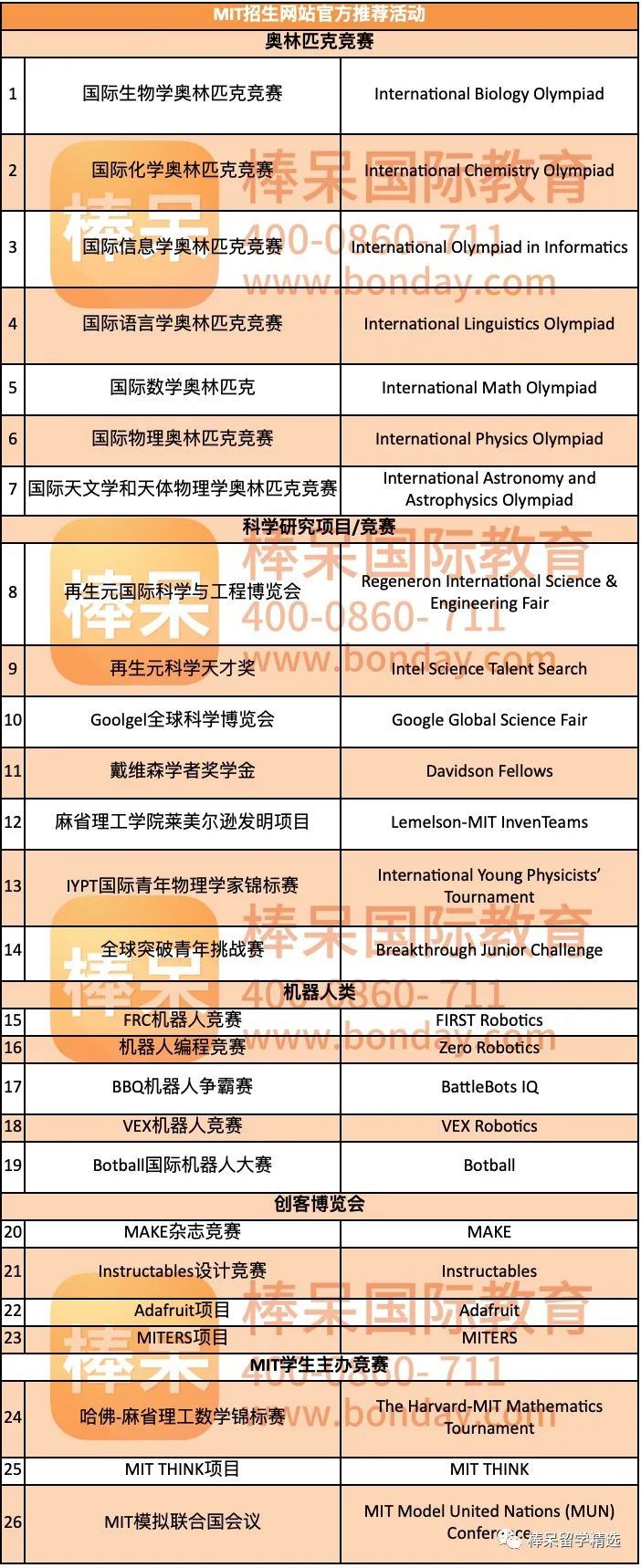 在MIT公布的活动列表里,包括“7大国际奥赛+7大科研项目/竞赛+5大机器人竞赛+4大创新竞赛+3大MIT官方主办的竞赛”。具体如下: