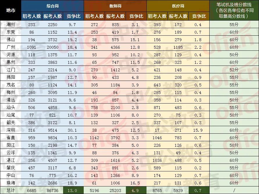茶茶为大家整理了去年广东集中招聘各地区的竞争比以及分数线情况,小伙伴们可以根据自己所报的地区大概预测一下,你的岗位需要考多少分才能进面!仅供参考: