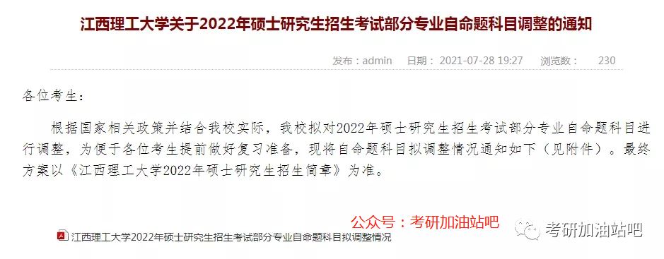 7月28日,江西理工大学发布《江西理工大学关于2022年硕士研究生招生考试部分专业自命题科目调整的通知》,拟对2022年硕士研究生招生考试部分专业自命题科目进行调整。