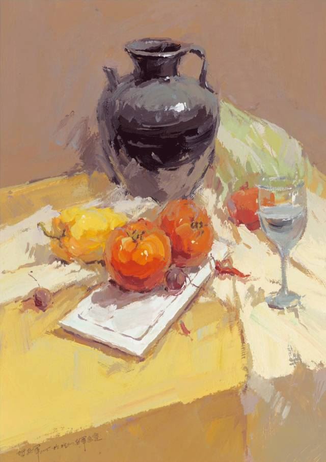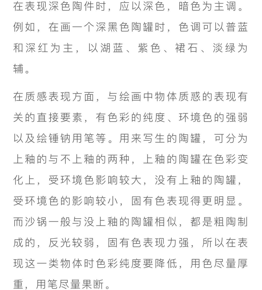 4、怎么表现质感,色彩的纯度、环境色的强弱等都有关系,表现陶罐时色彩纯度要降低,用色要厚重,用笔要果断。