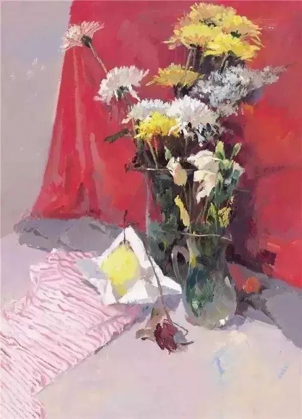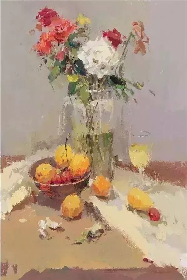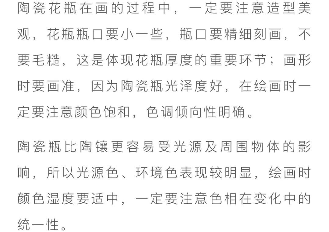 在画的过程中一定要注意造型美观,花瓶瓶口要小一些,瓶口要精细刻画,不要毛糙,这是体现花瓶厚度的重要环节,画时形要画准,在画时一定要注意颜色饱和,色调倾向性明确。颜色不要超过三种,环境色较少,大部分都是同类的灰色,稍微有一点色彩倾向。