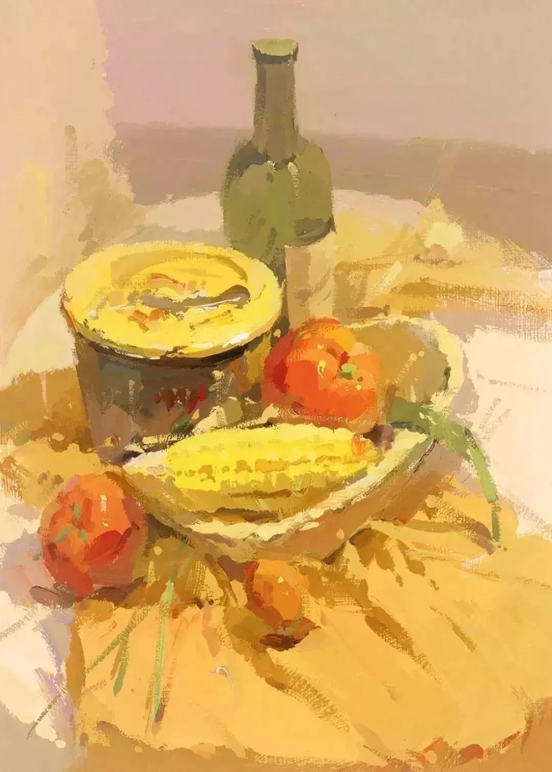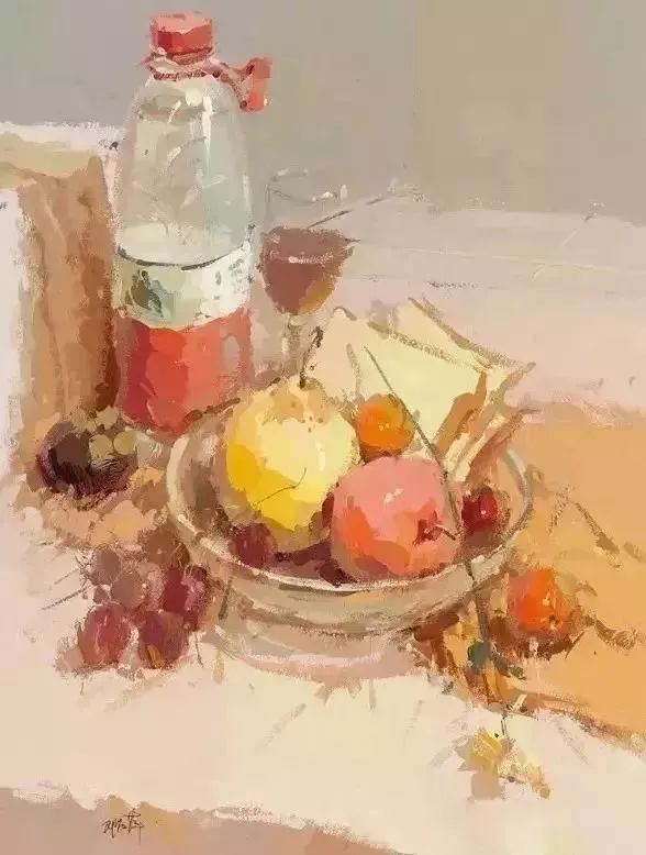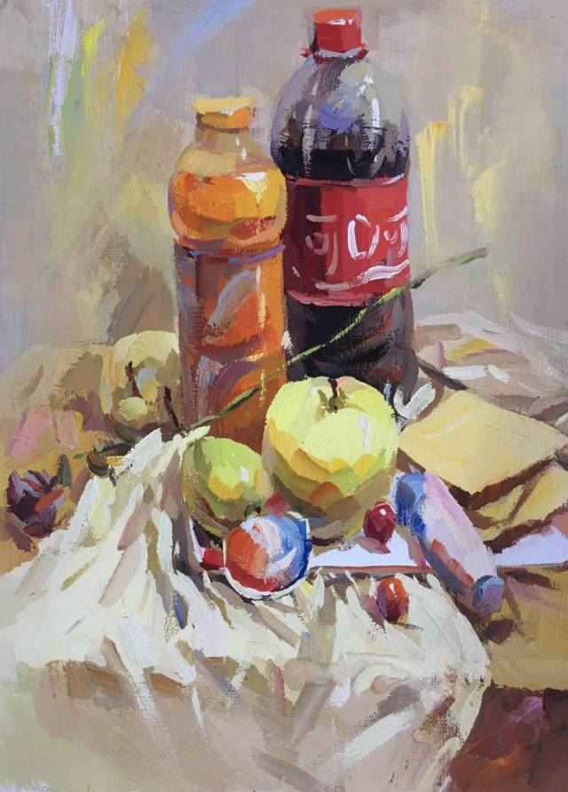 由小圆柱、圆锥和大圆柱组成。瓶子口部比较小,但也是需要精彩刻画的地方,可用小笔轻松表现,高光依附着肩部的变化,并不是很直的,可以略带点弧度,这样的表现更加生动。绿色的瓶身切记不要画得太“生”,可适当地加一些黄色,降低其纯度,融入画面的色调关系。