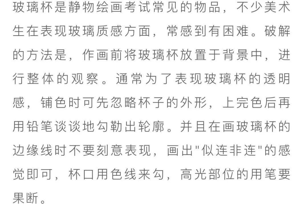 玻璃器皿应注意以下几点:1.玻璃器皿本身的质感,透明度较高,反光强烈,材质较为细腻。2.杯内液体的表现应简单、概括。3.应将其融入到整幅画面的环境之中,同时注意透视的把握。