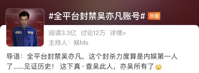 目前统计来看,微博、抖音、今日头条、百度百家号、微博超话、贴吧、爱奇艺、爱奇艺泡泡圈、腾讯视频、央视影音、豆瓣人物梅莉萨特里奥主页等等社交平台,吴亦凡相关的账号、聚集地都已经全部消失。