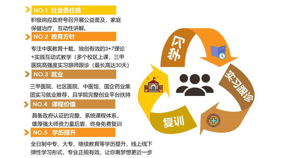 建立一套完善的双师联动教学模式,0基础学习+跟诊学习+就业上岗+开店创业=实现考医师的中医梦,让学员少走弯路,少花钱,就可以踏入中医道路,让学员学医不难,接触中医大师吸取精华就在身边。