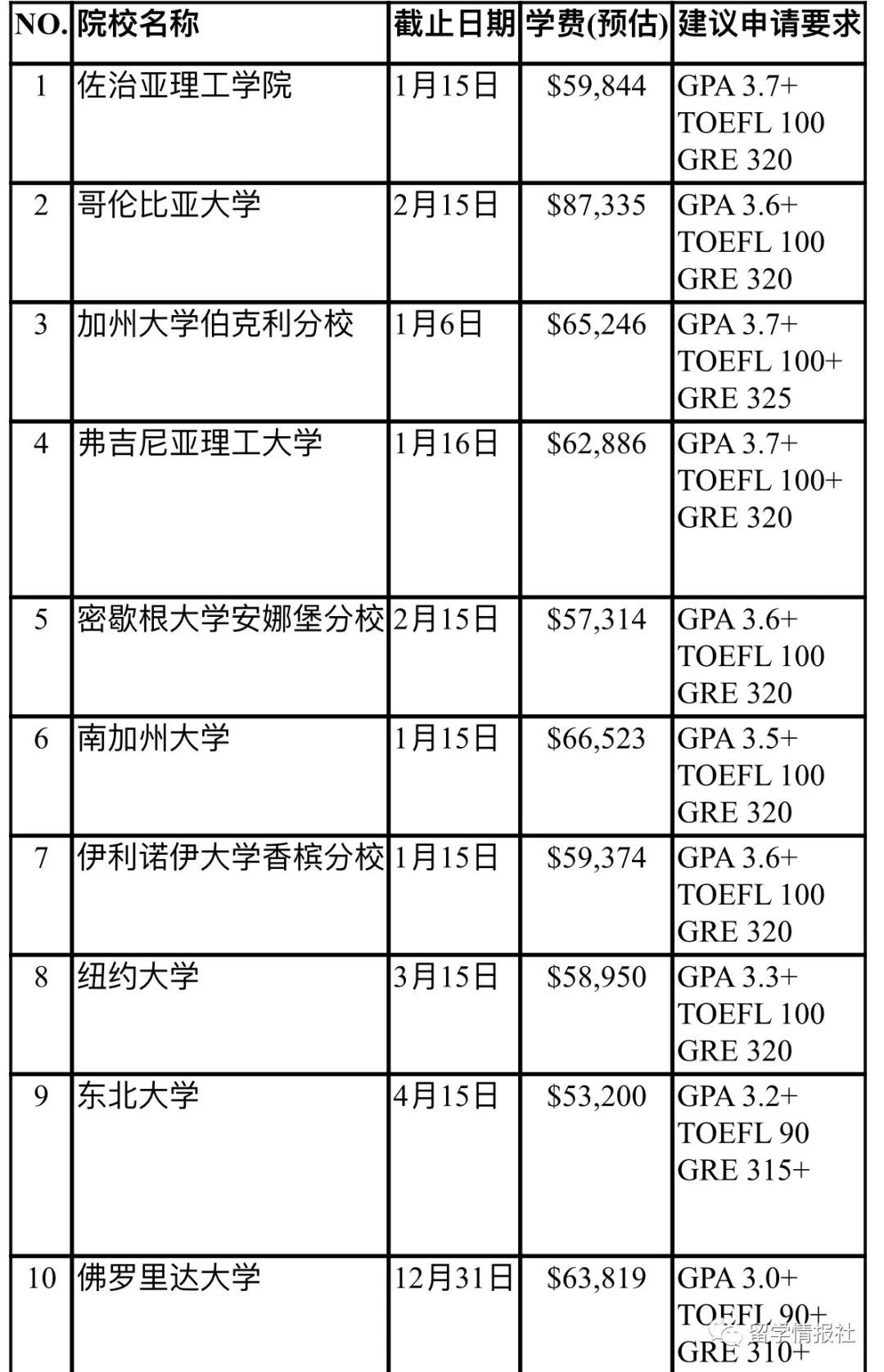 排名靠前的学校托福大多要求100。