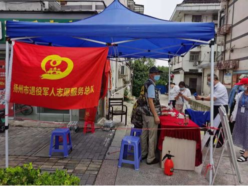 扬州市退役军人事务局党员干部积极响应号召,开展“党旗在抗疫一线飘扬、党徽在‘两在两同’中生辉”志愿服务行动,在核酸检测点、社区居民楼等服务点参加疫情防控,让党旗在抗疫一线飘扬。