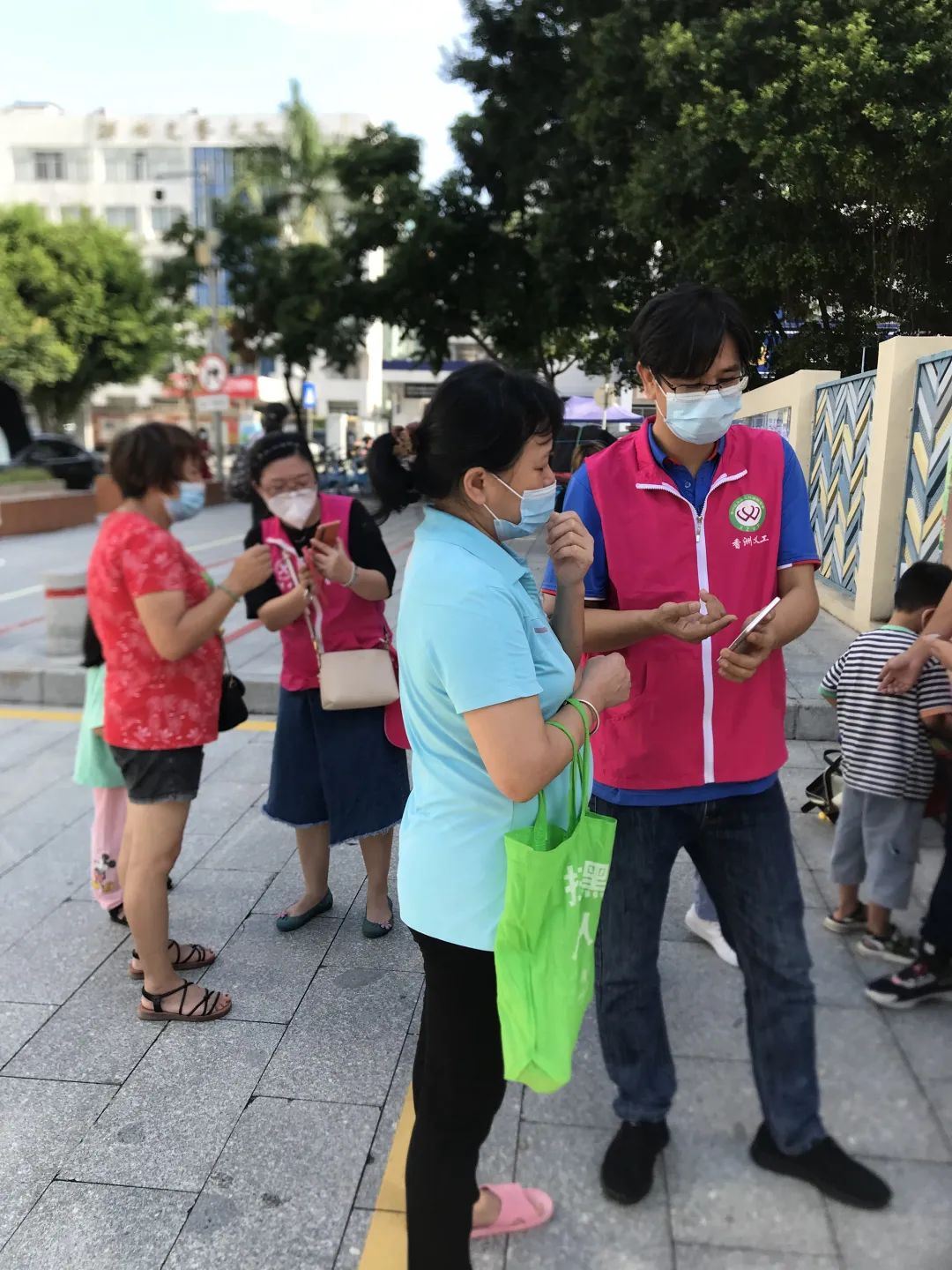 图/博爱幼儿园教师志愿者们在烈日下协助群众填写资料