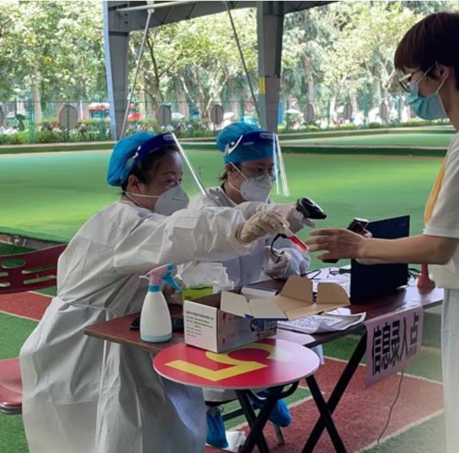 8月2日下午,厦门外国语瑞景分校的英语教师杜雪辉刚赶到莲前街道莲薇社区核酸检测点参与志愿工作。