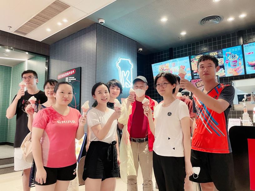 8月2日下午4点多,一群松柏中学教师志愿者们,像孩子一样,手拿甜筒冰淇淋在餐厅里一起合影!