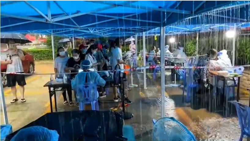 在经受早上烈日的烘烤后,大雨在午后袭来。官任社区检测点的志愿者们一边工作着,一边防着帐篷漏水,已经顾不上脚底湿鞋。