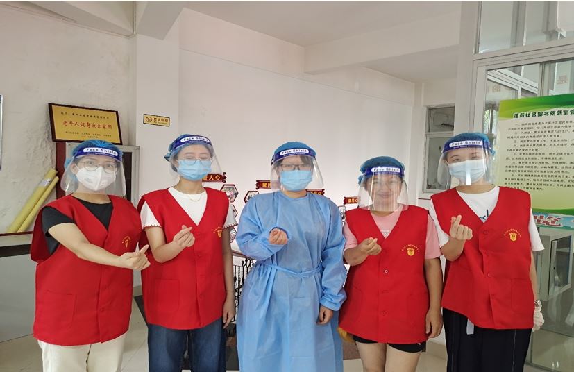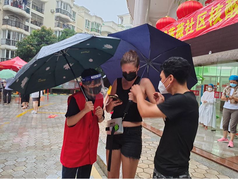外瑞志愿者潘俐南海四号校长赶忙上前询问情况,原来这位女士面对采样感到十分焦虑恐慌。潘俐老师一边安抚她的情绪,告诉不要过度焦虑;一边引导她要相信医务人员的专业水平,更要相信厦门的防疫措施;并用自身的生物专业知识告诉她,保持心情愉快能提高自身的免疫力,有助于抵抗病毒。