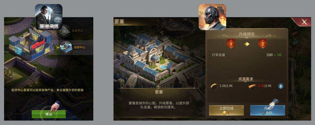 同理,SLG游戏还有另一重要元素——模拟经营。然而,模拟经营类游戏和SLG的模拟的目标也是不同的。如何判断一款游戏是否属于模拟经营类游戏,主要就看在核心玩法中是否存在人力-资源-建造三者的循环,玩家扮演一城之主,这个城有可能是个游乐园、酒店、甚至可以是监狱。SLG游戏前期的游玩和模拟经营非常类似,玩家作为城邦的所有者,大多主要是通过任务系统去完成任务,获得金币、资源等奖励然后用来升级发展建筑,所以只要玩家进行循环中的某一行为,就能直接影响到循环中的其它环节,可以是升级建筑变得更大更多,也可以是获得更多的游戏内货币,爽感来的非常及时。