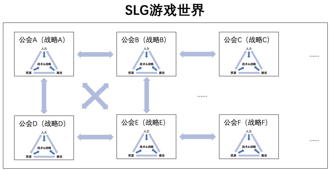 其三,公会使得战略自治。从整个SLG的世界来说,不同的公会共存在整个世界里面,这像极了交织的生态,公会间则会形成各种可能的关系,例如竞争关系、合作关系、竞合关系等,像极了现实世界里各国之间丰富的多边关系,所以公会间就像大国集团一样存在着自治自理,本质上就是不断地主动追求增长与扩张以壮大公会。面对SLG游戏世界中混序的场景,公会间不同方式的交流为整个游戏世界输送着新鲜与活力。