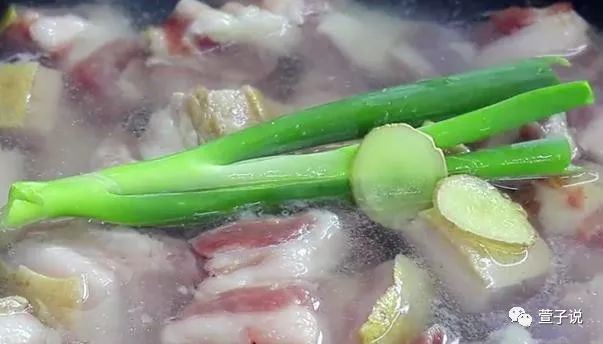 把切好的五花肉块放到一个锅里头,然后倒上能够没过肉块的清水,这就是要把五花肉块焯一下,锅里头再放上两段大葱,几片生姜倒上一些料酒,