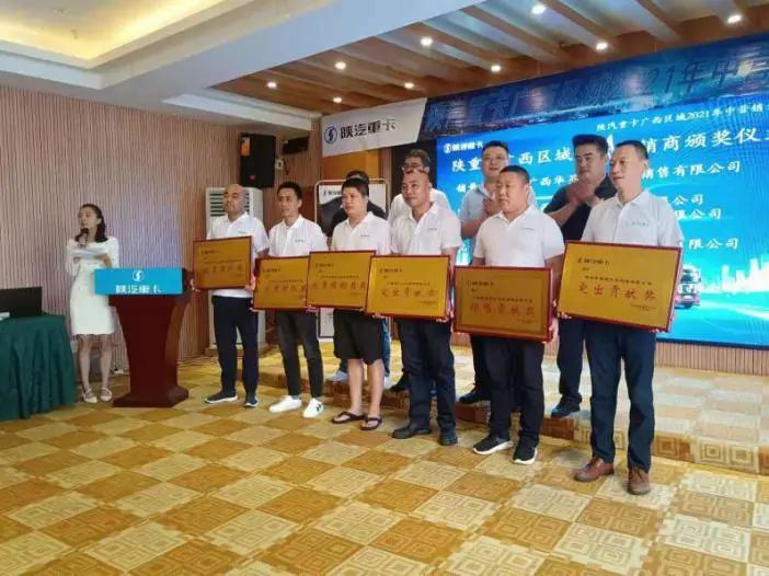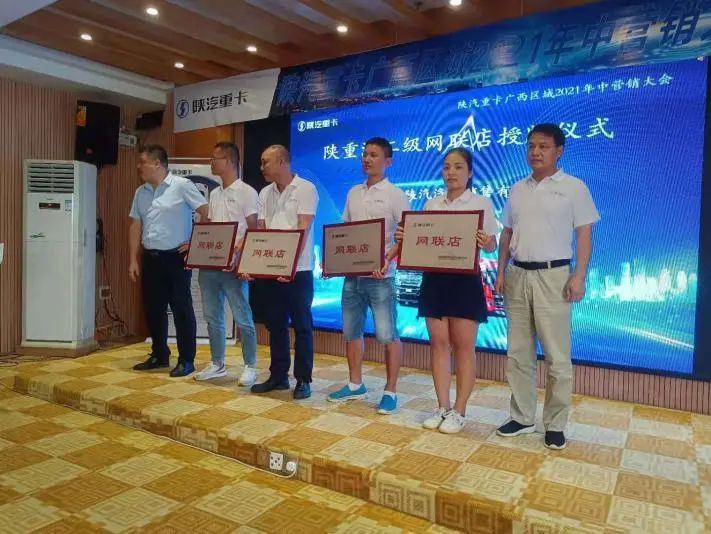 表彰环节,此次会议对陕汽广西区域2021年上半年销售贡献奖、突出贡献奖、优秀经商奖、优秀团队奖进行依次表彰,同时也对二级网联店进行了授牌仪式。