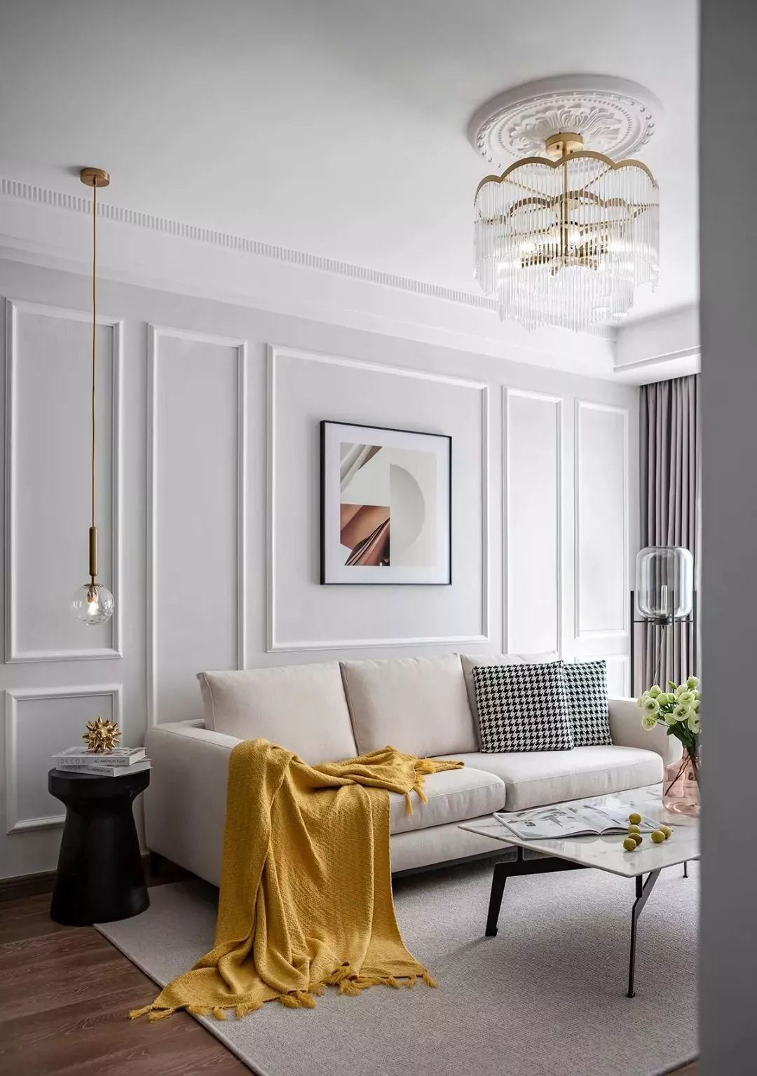 优雅的灰色背景加上简洁的线条装饰,护墙板的效果,让人感觉更加高雅有质感。浅咖色的一字型沙发,搭配千鸟格单人沙发和抱枕,通过姜黄色搭毯进行提亮,优雅舒适,灵动不单调。优美造型的水晶吊灯,就连灯座也是很唯美的,还有吊灯和落地灯,质感与设计感兼具。客厅与餐厅之间以背景和边柜进行区域的划分,木色背景与白色的边柜,加上艺术的摆件,形成一处不错的端景。