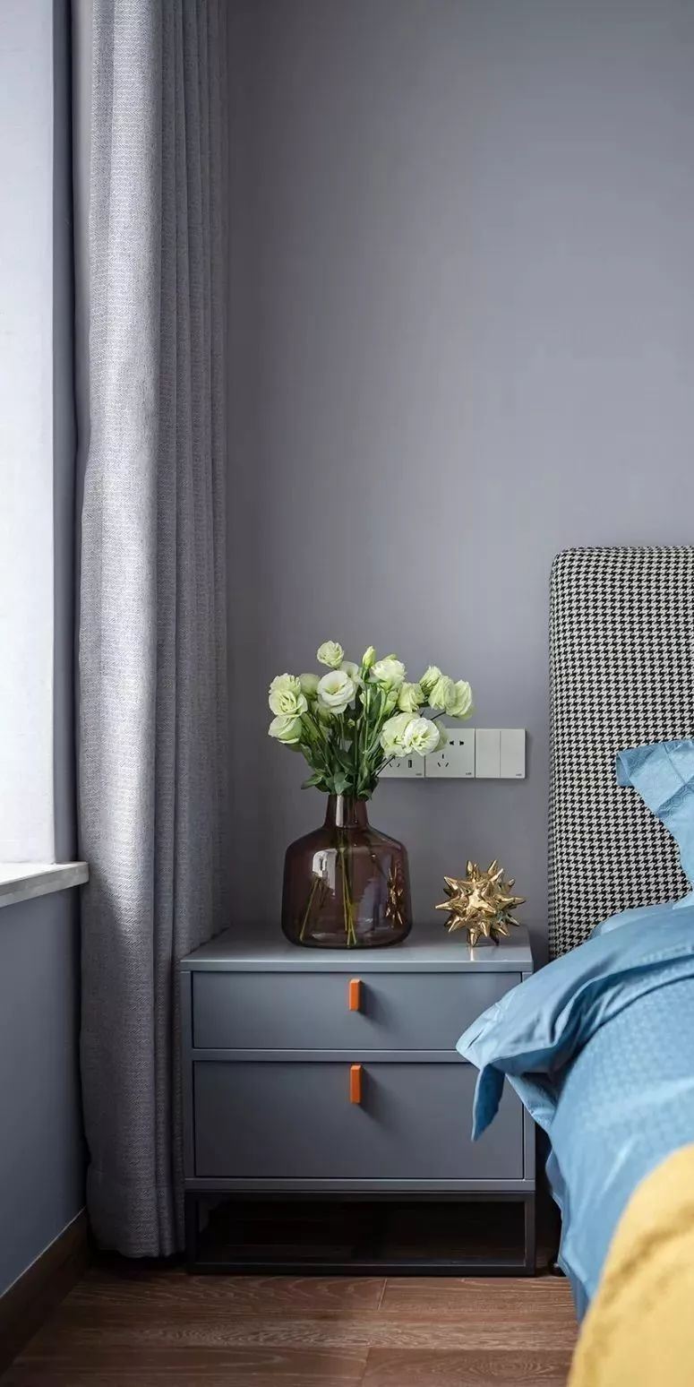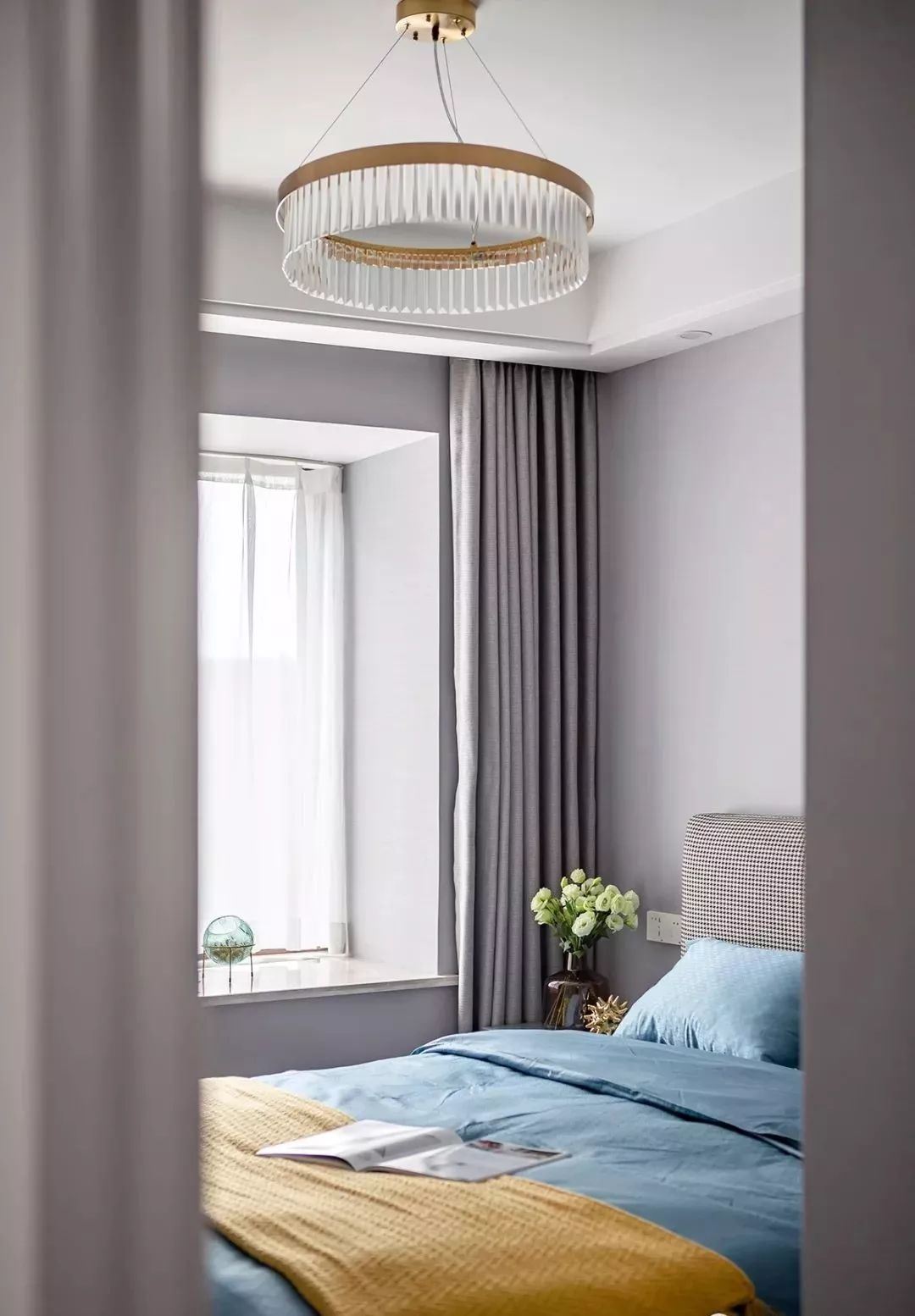 主卧室采用了安静沉稳的色彩,让生活更加简单,让家更加平和,让睡眠更加舒适。黄色的搭毯、床头的鲜花,是美好生活的一个调剂,给人以积极向上的力量。