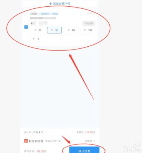 第三步,选择添加完成的户号,选择需要缴纳的金额,点击下方对应的“确认交费”。