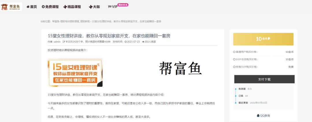 帮富鱼是专注于投资理财课程的网站,课程涵盖市面上绝大部分的理财课程,全面且专注。跟商学院的理财课相比,价格便宜很多,跟一般的网站相比,又全面得多。 家庭理财知识