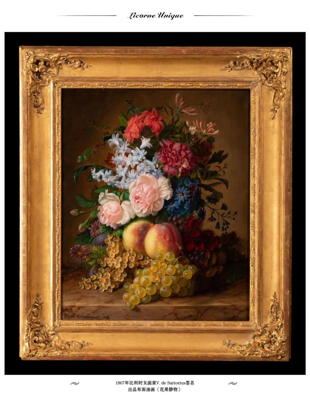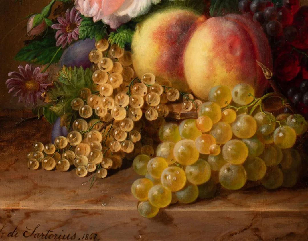 1867年?利时女画家V. de Sartorius签名出品布?油画《花果静物》/独角鹿臻选Virginie在花果静物画上画艺过人,她的作品曾参展1852年安特惠普举办的皇家美术促进协会沙龙展、1855年巴黎国际博览会,以及1861年法国梅茨举办的沙龙展览,1872年,44岁的她仍在沙龙上展出作品。七分黑木耳Virginie de Sartorius的一生,几乎只留下与绘画有关的记录。除了各种展览,我们还知道,在1873年,她的一幅花卉绘画参展博览会,并且被利日市立博物馆(Musées Communal - Liège)收藏。1863年出版的《La noblesse artiste et lettrée: Tableau historique》中提到了出生于古老贵族家庭的Virginie de Sartorius小姐及她的作品。