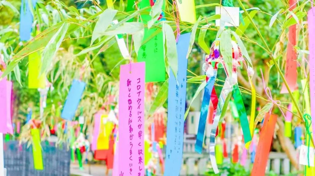写愿望诗笺:每年此时,日本的大人小孩都会聚在一起,用长条诗笺写下愿望和诗歌,写完后,把纸条挂在自家院子的小竹子上,进行祈愿。