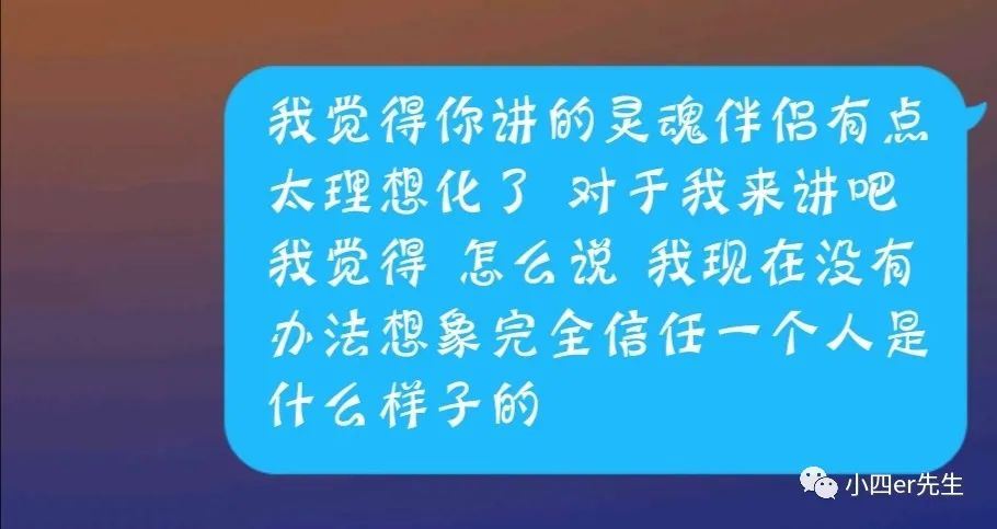 我总觉得灵魂伴侣这种事情是需要完全信任的,是需要完完全全的赤裸相对的。处在相同频率层面,互相了解,彼此坦诚,始终以热忱的态度面对彼此。
