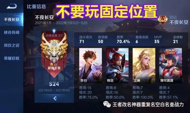 而且当你打出连胜以后那么就要继续打,千万不要害怕打得多会输,要知道有“安排”你输也就会有“安排”你赢酷宝影,这个时候千万不要害怕,见过有不少玩家连胜三四场就吓得不敢打,还怕接下来输了自己控制不住,然后就一直输,其实关于连胜有一个小妙招,那就是当你打出连胜后就继续打,等到输了一把以后就停止,不管是因为什么情况而输都不要继续了,直接打匹配或者娱乐模式,打到连败出现后再排位。