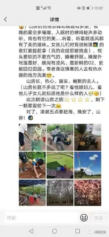 为期两天的暑期亲子乡村耕读体验营愉快地结束啦,耕读山房在这个过程中看到了孩子们的勇敢和智慧,感受到每个孩子为了获得、付出的努力。在活动结尾,耕读粒粒采访到了一位父亲,聊了聊参与的体验感受:这次活动把人带到自然里,还把书上硬邦邦的知识带到真实场景让孩子有真切感受,体验感很好。小孩子也挺让我惊喜,儿子平时在生活里是个小馋猫,但这次他获得、付出努力更多体验很自然及粒粒皆幸苦知识,在乡村,我发现他的自控力真的有蛮大进步。身处优越的条件,学会感恩、学会珍惜!耕读山房还在朋友圈里刷到了许多好评: