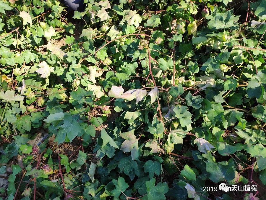 有部分棉田由于7月中旬缺水干旱严重,造成大面积倒伏现象?;褂胁糠置尢锛胤适┑纳伲拗昃ジ巳狈氏溉?,易出现倒伏现象?;故且徊糠置尢锓⑾炙淙皇┘毓?,但是棉田地里施钾不均衡。由于高含量的钾肥多数比较难溶化,在棉田或泵房没有进行二次稀释,多数钾肥没有及时融化,造成棉田施钾不均匀,而棉田片区缺钾就造成棉株倒伏。从调查来看,部分棉田点片出现低温红叶早衰现象,看来近期小范围降雨降温幅度较大,对棉田棉花存在一定的影响。