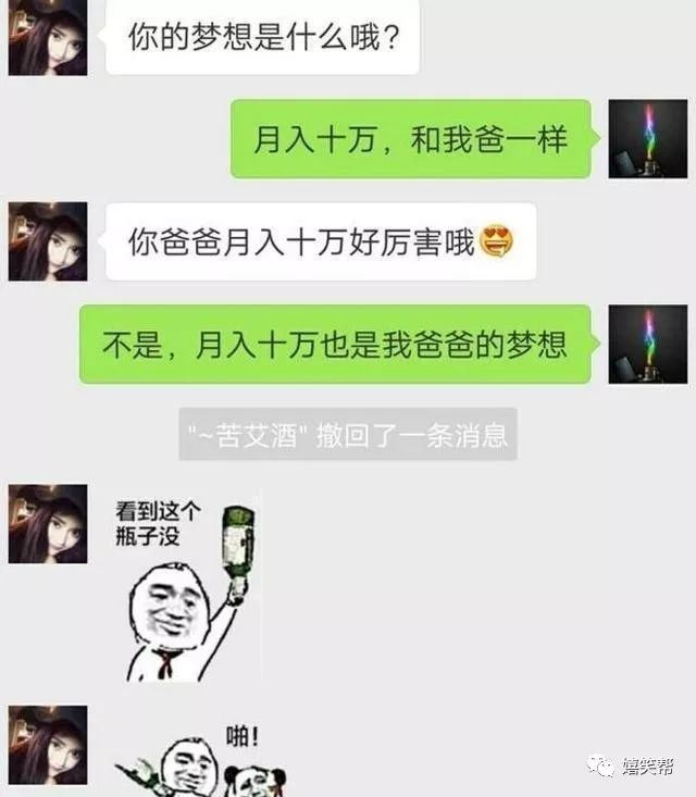 阳阳的搞笑聊天记录:前几天想约个女朋友一起去摘草莓,她却一口回绝了我。我不解地问她“为什么呀?”,她看着我,非常坚决地说了句“我不喜欢爬树!”阳阳的搞笑聊天记录:想起很多年前一个事,一次和朋友出门,哥们尿急上厕所,找到一公园公厕,看厕所大爷:五毛!我那哥们华丽丽的来了句:草这么贵,三毛行不?时隔多年我还是想忍不住问一句,哥们,你到底急是不急啊 ?