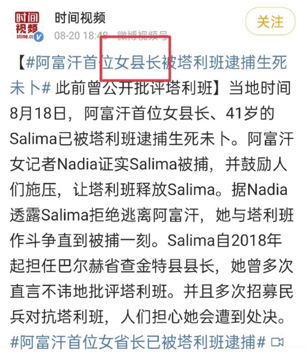 时间视频的消息称,当地时间8月18日,阿富汗首位女县长、41岁的Salima已被塔利班逮捕生死未卜。阿富汗女记者Nadia证实Salima被捕,并鼓励人们施压,让塔利班释放Salima。