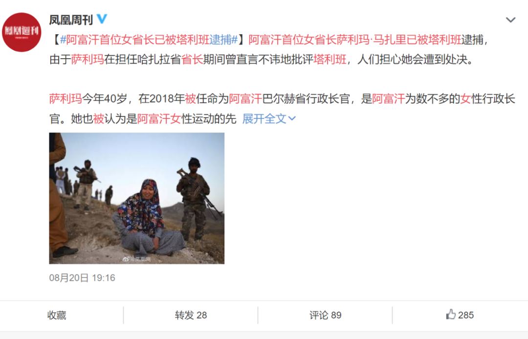 21日,凤凰网的报道称,阿富汗女官员萨利玛·马扎里已被塔利班逮捕,由于萨利玛在任职期间曾直言不讳地批评塔利班,人们担心她会遭到处决。
