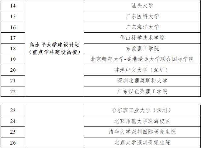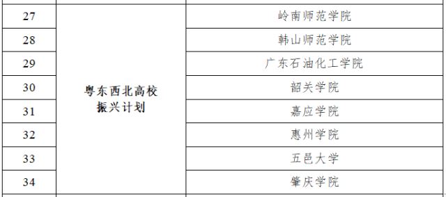 与上一轮相比,减少了4所高校。其中,广东医科大学、广东海洋大学“升舱”为高水平重点学科建设高校,广东药科大学云浮校区和广东技术师范大学河源校区均已开学启用。省教育厅有关负责人表示,粤东西北高校振兴计划建设高校以“补短板”为目标,着力补齐自身和区域高等教育短板,大力提升办学条件和师资队伍,打造一批支撑区域经济社会发展的重点学科专业。其中,到2025年,实现地市本科高校(校区)全覆盖及高质量建设,粤东粤西粤北地区高校办学条件进一步改善,新增2—3所高校达到硕士学位授权单位建设要求。建设国家级一流本科专业20个左右,省级一流本科专业90个左右,30个左右专业通过国内或国际权威组织专业认证。博士学位专任教师数占比进一步提高,生师比进一步下降,教师队伍整体水平进一步提升。全省有13所高校入选特色高校提升计划,与上一轮数量相比,减少1所。13所高校分别是广东财经大学、仲恺农业工程学院、广东药科大学、星海音乐学院、广州美术学院、广州体育学院、广东技术师范大学、广东金融学院、广东警官学院、广东第二师范学院、广州航海学院、深圳技术大学、广东开放大学。