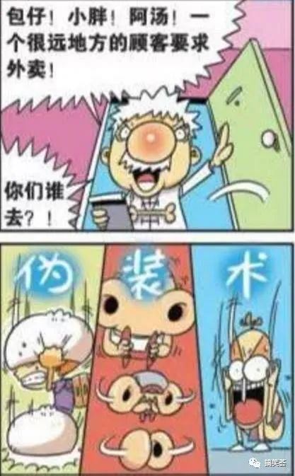 这时候老爸接到一个单于是推开屋里的门说道:“包仔!小胖!阿汤!一个很远的地方顾客要求外卖!你们谁去?”四人马上实行伪装术!