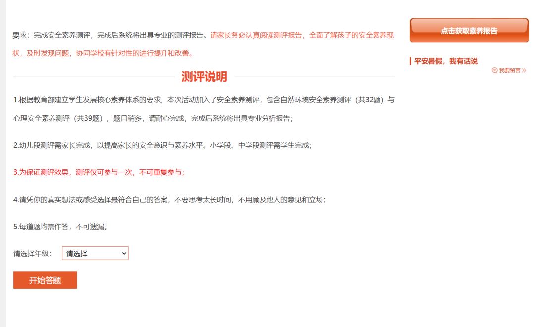 根据教育部建立学生发展核心素养体系的要求,本次活动加入了安全素养测评,包含自然 环境安全素养测评(共32题)与心理安全素养测评(共39题),题目稍多,请耐心完成,完成后系统将出具专业分析报告;