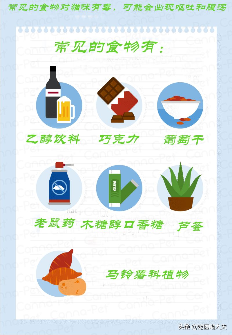 这些食物对猫有毒。最好避免日常生活中的猫联系这些食物; 当猫有急性中毒和呕吐时,在原因未知的情况下,建议找到兽医到宠物医院。