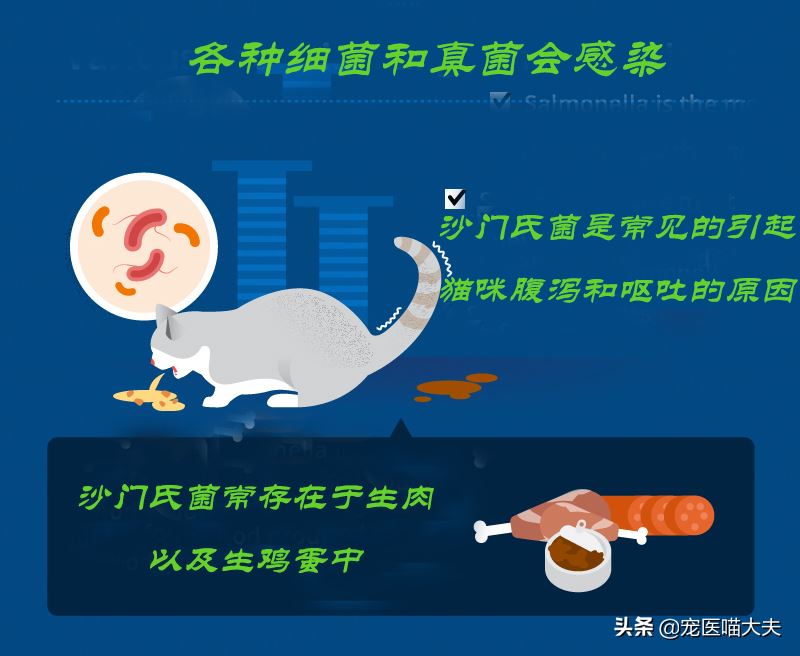 有许多形式的细菌, 真菌可能导致呕吐和腹泻。最常见的细菌是沙门氏菌。沙门氏菌主要存在于受感染的肉和蛋食品中; 由于真菌,猫经常导致酵母感波比埃登染,当酵母感染肠子时,猫将有水样和呕吐。