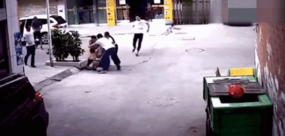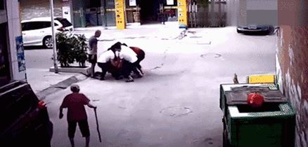 这些人把画面中可怜求救的父亲扑倒在地,殴打他,并且大声地叫喊着: