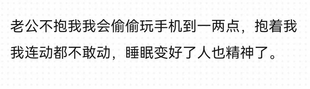最初在一起,我硬拉着老公的手抱着我睡,一睡熟,他就背对着我了,现在时间久了,他一睡熟就惯性抱着我。