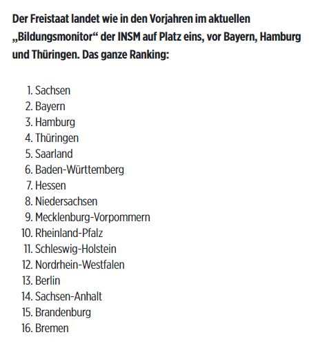 近日,德国新市场经济协会(?Initiative Neue Soziale Marktwirtschaft“ (INSM))发表“2021年教育观察年报”。在这项全德各联邦州教育水平对比中,萨克森州再次蝉联排名第一。