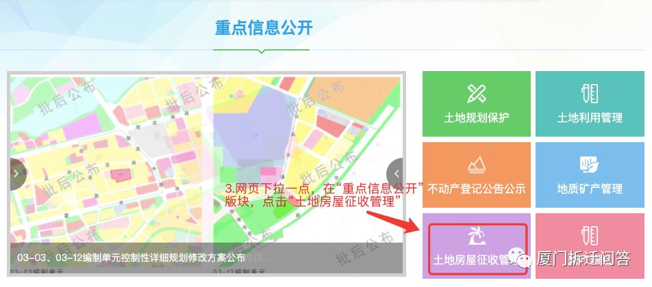步骤三:将网页下拉一点,“在重点信息公开”版块,找到“土地房屋征收管理”??椋ㄈ缤迹?。