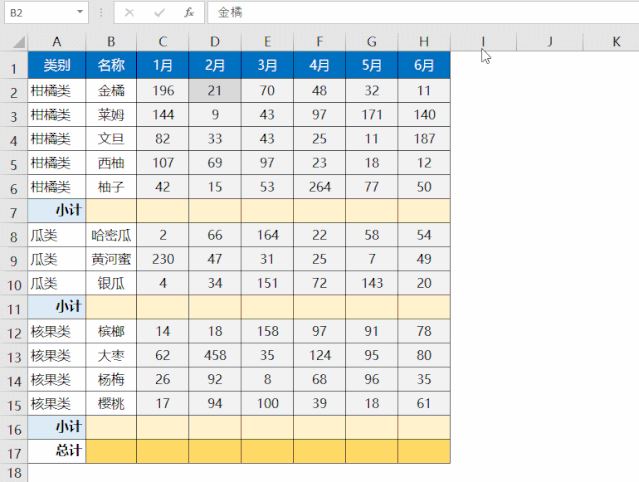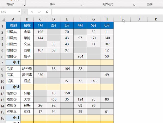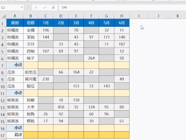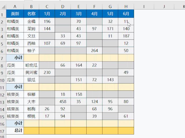 如下图所示,需要批量设置小计行公式。如果C:H列没有空白单元格(如下图所示灰色单元格),先按Ctrl+g定位高阶女祭司洛苏娜空值,然后再按Alt+=设置求和公式。